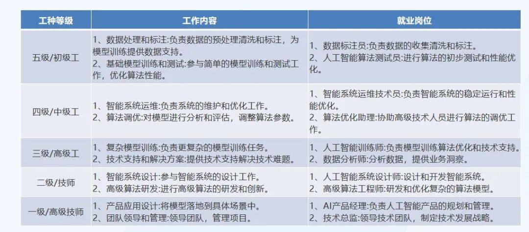 算法锻炼取测试岗亭:人工智能算法测试员、初级/中级/高级人工智能算法工程师考取人工智能锻炼师证书,正在人工智能产物现实利用过程中进行数据库办理、算法参数设置、人机交互设想、机能测试及其他辅帮功课的人员。就是给本人多加个“职场Buff”!
